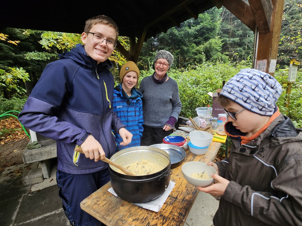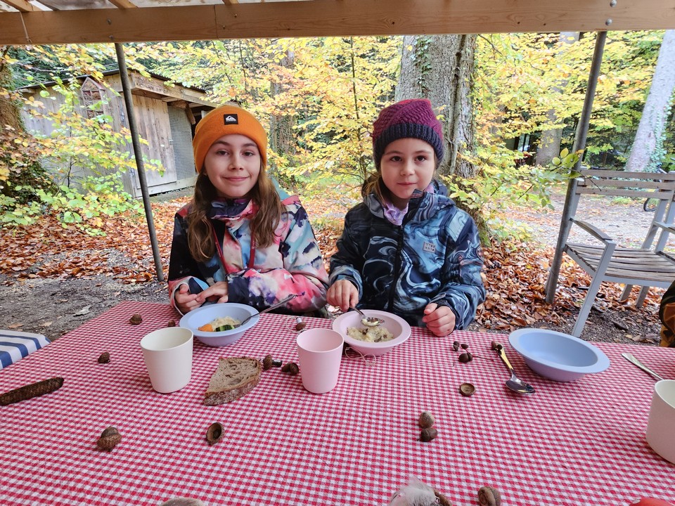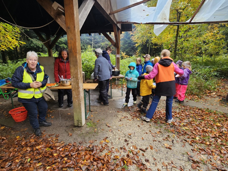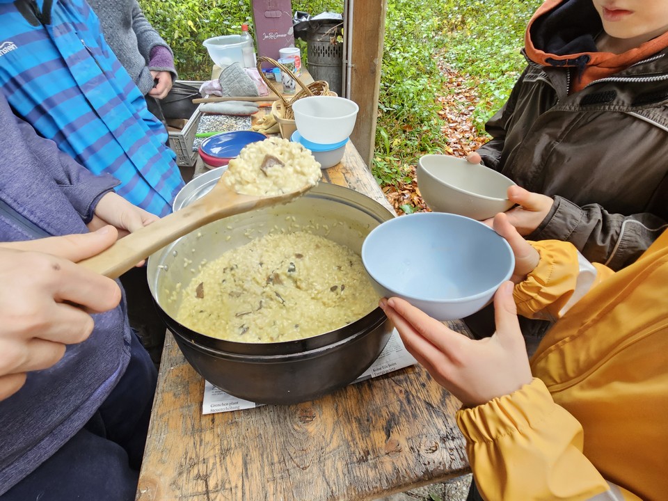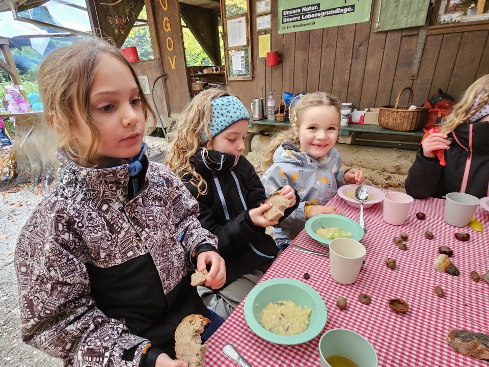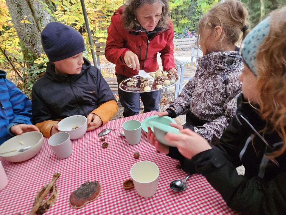 Trotz nasskaltem Wetter wurde gelacht, gesammelt und entdeckt. Danach zauberten alle gemeinsam ein feines Pilzrisotto, ein süsses Igeli-Dessert und leckeres Dipgemüse auf den Tisch.