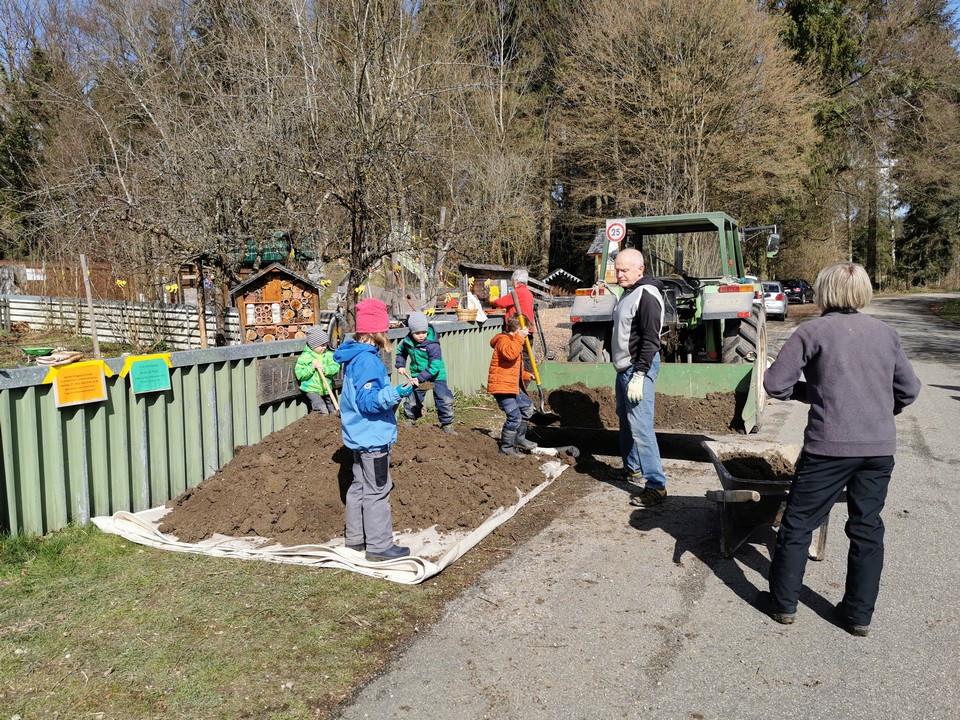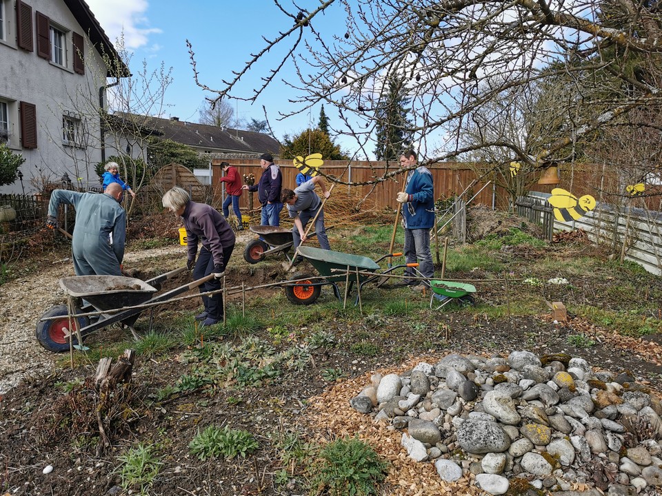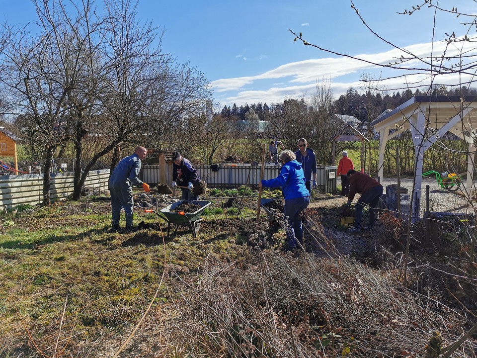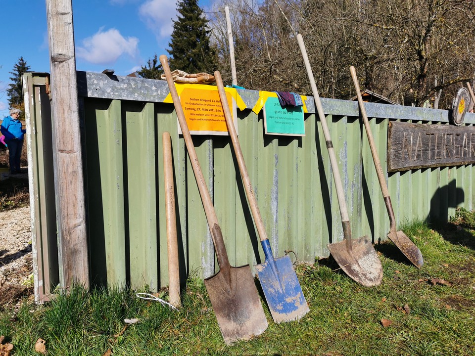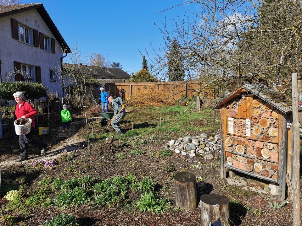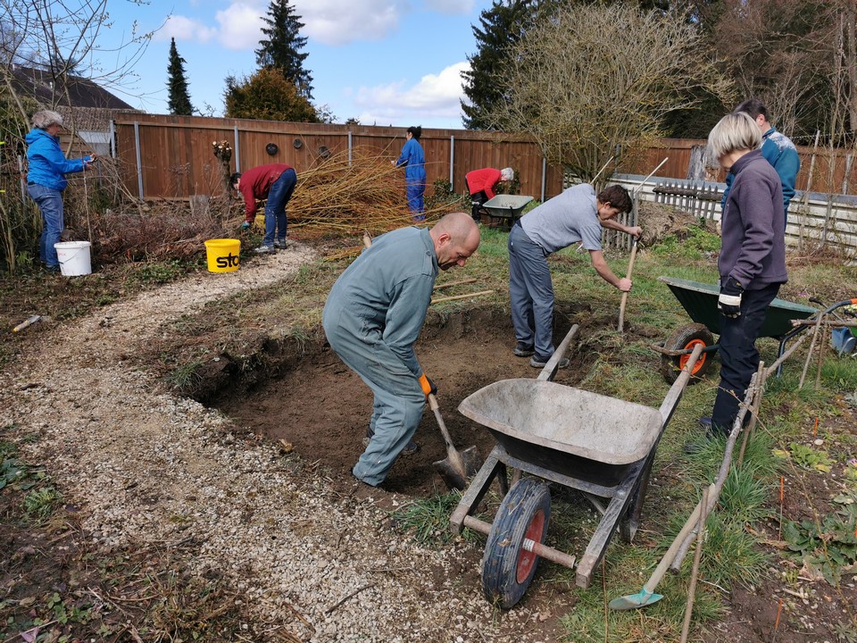 Der erste Arbeitseinsatz in diesem Jahr fand bei schönstem Wetter statt. 15 Erwachsene und 10 Kinder kümmerten sich um unseren Naturgarten, schnitten Kopfweiden, entfernten nährstoffreichen Humus für unsere Wildblumenwiese, jäteten einheimische Blütenstauden frei, schichteten Asthaufen, hängten Nisthilfen auf, die Steinlinsen beim Bach wurden freigelegt und Bussardstangen wieder eingesammelt.